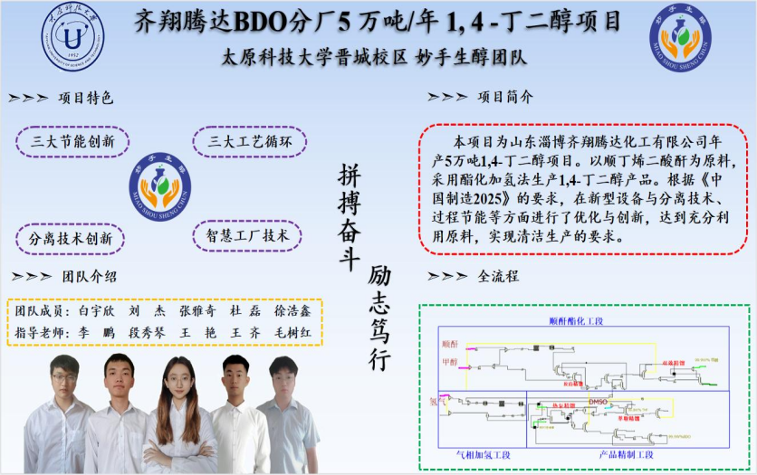 今年全国大学生化工设计竞赛题目为:“为某大型化工企业设计一座1, 4-丁二醇生产分厂或为现有的1, 4-丁二醇生产分厂设计技术改造方案,要求技术符合中国绿色低碳发展要求”,需要学生关注我国化学工业发展进程中的重大需求,综合运用所学化学工程专业知识、基于新时代化工设计理念、使用AutoCAD、Aspen Plus、CADWorx、SketchUp等设计、模拟、仿真软件完成一座满足绿色低碳发展需求的1, 4-丁二醇生产装置设计项目设计,具体要完成包括可行性研究、工艺流程设计、设备设计选型、自动控制、车间及工厂布置、环境评价、安全评价及经济分析等二十余项子项目。我校“醇醇欲动”团队和“妙手生醇”团队贯彻“低碳、环保、安全、经济、创新、合理”设计理念,分别采用“改良炔醛工艺”、“顺酐酯化工艺”,在工艺路线、反应技术、分离技术、过程节能、设备设计、自动控制、智慧工厂等多方面进行创新,最终完成“山西榆社化工股份有限公司9.5万吨/年1, 4-丁二醇项目”、“齐翔腾达BDO分厂5万吨/年1, 4-丁二醇生产项目”设计。