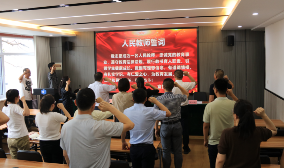 为增强学院教师荣誉感和使命感,激发全体教师爱岗敬业、勇于奉献的敬业精神,大会进行了“重温人民教师誓词”宣誓仪式。全体参会教师在赵玉英副院长带领下,紧握拳头,列队肃立,庄严宣誓。