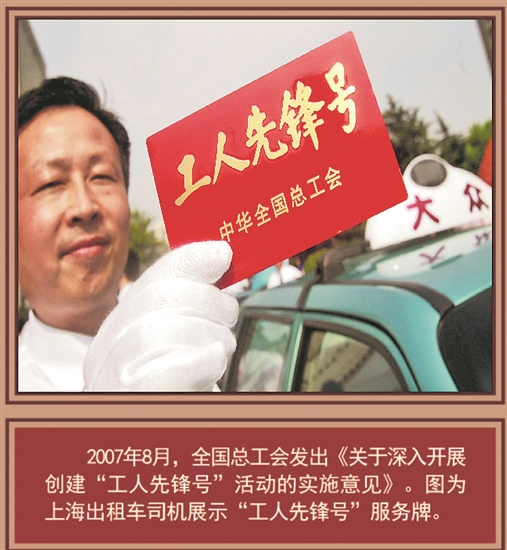 2007年8月,全国总工会发出《关于深入开展创建“工人先锋号”活动的实施意见》。图为上海出租车司机展示“工人先锋号”服务牌。