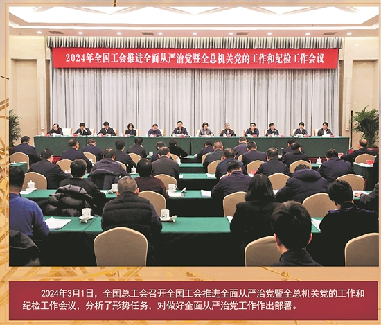 2024年3月1日,全国总工会召开全国工会推进全面从严治党暨全总机关党的工作和纪检工作会议,分析了形势任务,对做好全面从严治党工作作出部署。